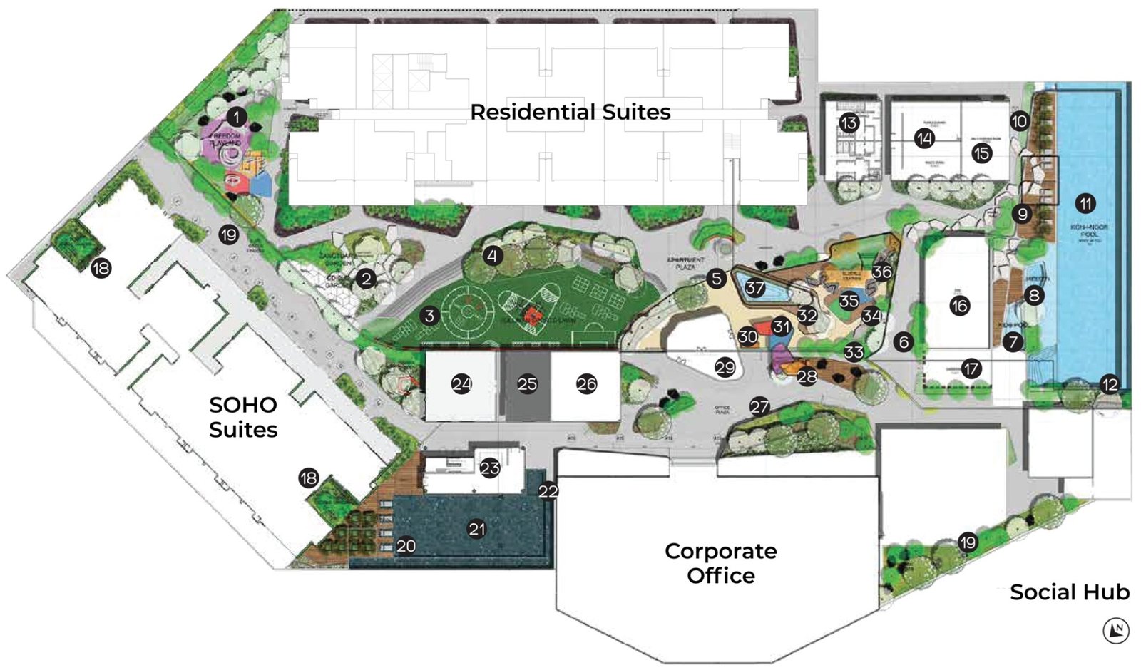 This is not a standalone office block. It sits within a 13.56-acre self-sustaining hub that integrates a lifestyle mall, street retail, SOHO suites, and residential towers — all under one address.